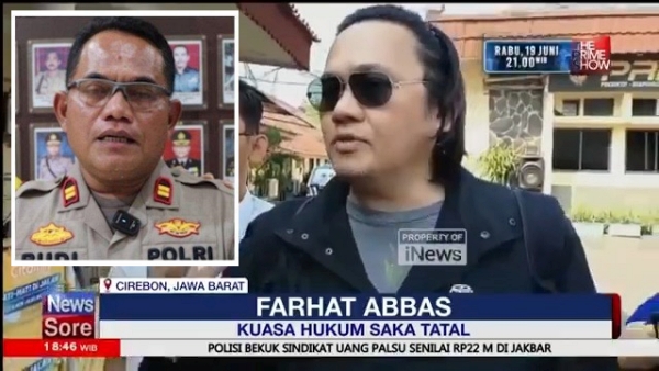 Kuasa hukum Saka Tatal, Farhat Abbas mendatangi Mapolres Cirebon Kota untuk melaporkan Iptu Rudiana, Senin (17/6/2024).