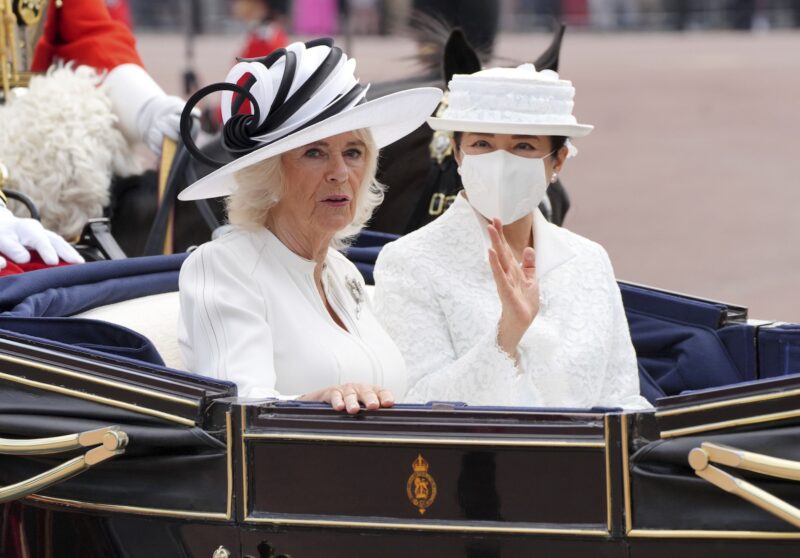 Ratu Camilla dan Permaisuri Masako menaiki kereta terbuka saat upacara penyambutan kunjungan kenegaraan kaisar dan permaisuri Jepang ke Inggris, di London pada hari Selasa. Gambar: Jonathan Brady, Pool melalui AP