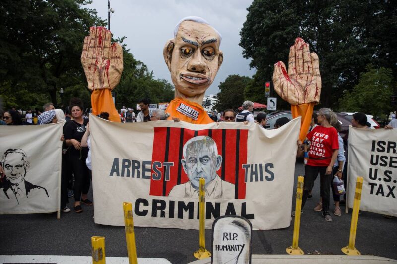 Para pengunjuk rasa berkumpul di luar gedung eksekutif dekat Lafayette Park dan meneriakkan slogan-slogan solidaritas dengan Palestina. Mereka menyebut Netanyahu sebagai “penjahat perang” dan menuntut diakhirinya serangan Israel di Jalur Gaza.