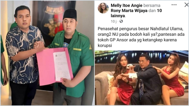 “Penasihat Pengurus Besar Nahdlatul Ulama, apakah orang NU itu bodoh? Tidak heran ada tokoh GP Ansor yang terjerat kasus korupsi,” Akun Facebook “Melly Itoe Angie” menulis di media sosial Facebook.