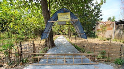 Di bagian pintu masuk terdapat gapura sederhana terbuat dari bambu, beratap terpal, dan papan bertuliskan “Makam Keluarga R Wachjoe Kartaamipraja”.