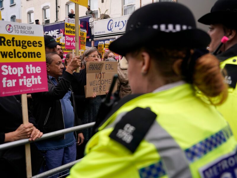 Di luar pusat imigrasi di kawasan Walthamstow di London timur, seorang pemimpin protes tandingan berteriak: “Fasis enyahlah” dan ratusan orang menanggapi: “Minggir dari jalan kami.”