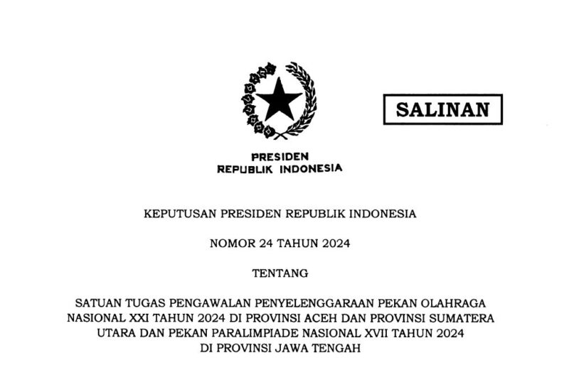 “Dalam rangka pengawasan penyelenggaraan Pekan Olahraga Nasional ke-21 Tahun 2024 di Provinsi Aceh dan Provinsi Sumatera Utara serta Pekan Paralimpiade Nasional ke-17 Tahun 2024 di Provinsi Jawa Tengah mulai dari persiapan, pelaksanaan, hingga pertanggungjawaban, telah dibentuk Satuan Tugas Pengawasan Penyelenggaraan Pekan Olahraga Nasional ke-21 Tahun 2024 di Provinsi Aceh dan Provinsi Sumatera Utara serta Pekan Paralimpiade Nasional ke-17 Tahun 2024 di Provinsi Jawa Tengah,” demikian bunyi Pasal 1 beleid tersebut yang dapat diakses pada laman https://www.satgas.go.id/index.php/id/satgas-pengawasan-pelaksanaan-pekan-olahraga-nasional-ke-21-tahun-tahun-2024-di-provinsi-jateng-dan … Sekretariat Kabinet JDIH.