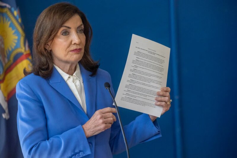 Port Washington, New York: Gubernur Negara Bagian New York Kathy Hochul menandatangani perintah eksekutif di Port Washington, New York. (Foto oleh Howard Schnapp/Newsday RM melalui Getty Images)