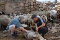 Berbaring telentang, domba itu berjuang saat pria itu mendekat untuk membalut ambingnya, yang telah terbakar dalam kebakaran bulan lalu yang menewaskan ratusan domba di…