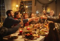Potret Pemuda Kulit Hitam Tampan Melamar Roti Bakar di Meja Makan Natal. Keluarga dan Teman Berbagi Makanan, Angkat Gelas dengan Sampanye, Bersulang, Rayakan Liburan…