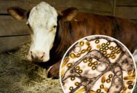Seekor sapi sedang beristirahat di kandangnya. Di latar depan terdapat mikrograf elektron transmisi berwarna dari partikel virus H5N1 (kuning). Pada tahun 2024, flu burung…