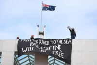 Keempat pengunjuk rasa membentangkan beberapa spanduk bertuliskan, 'Dari sungai ke laut, Palestina akan merdeka' dan 'Tidak ada perdamaian di tanah yang dicuri'. Para pengunjuk…